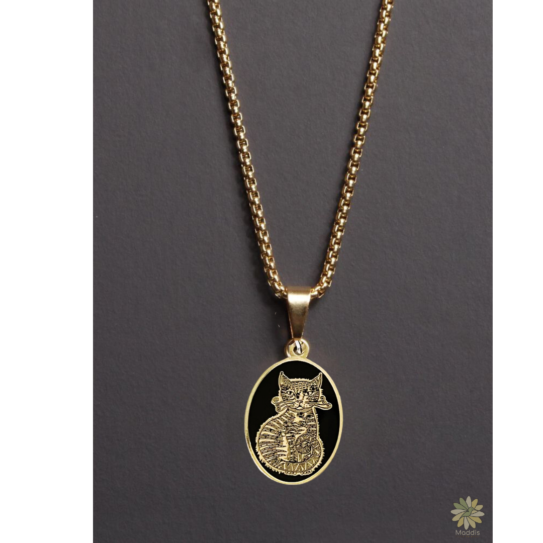 Ideal para los amantes de los felinos y de lo esotérico, este colgante es una pieza que combina la estética clásica con el encanto moderno. La silueta del gato, adornada con ornamentos y jeroglíficos, invoca la sabiduría y la gracia que se atribuyen tradicionalmente a estos animales en las culturas antiguas. Esta joya no solo es un accesorio, sino un talismán que promete ser el centro de todas las miradas.