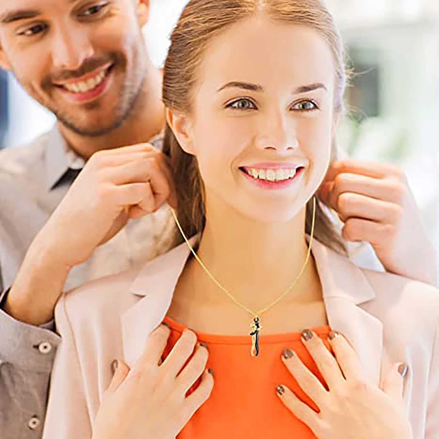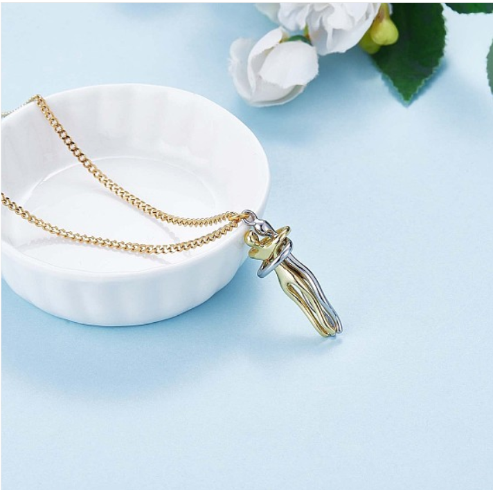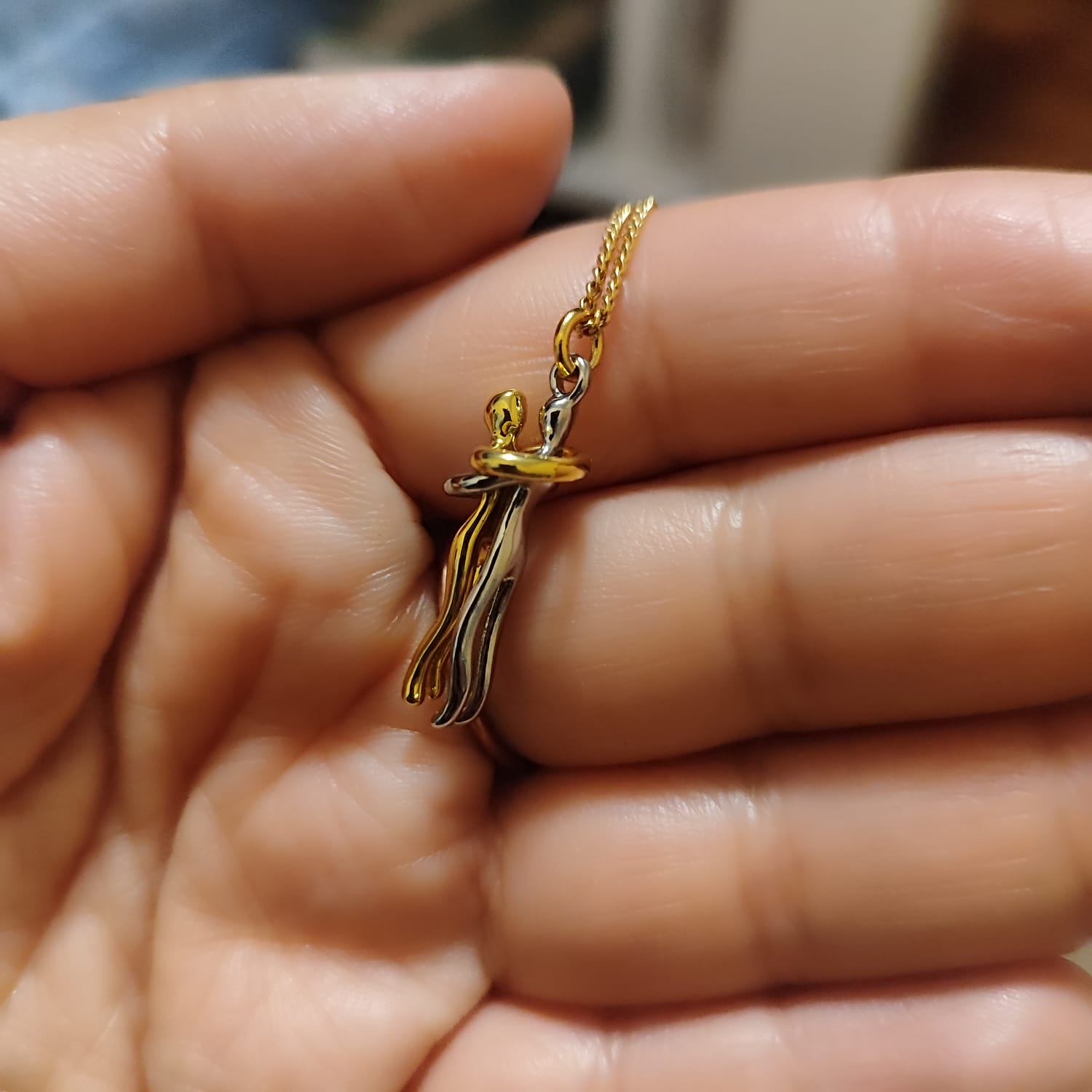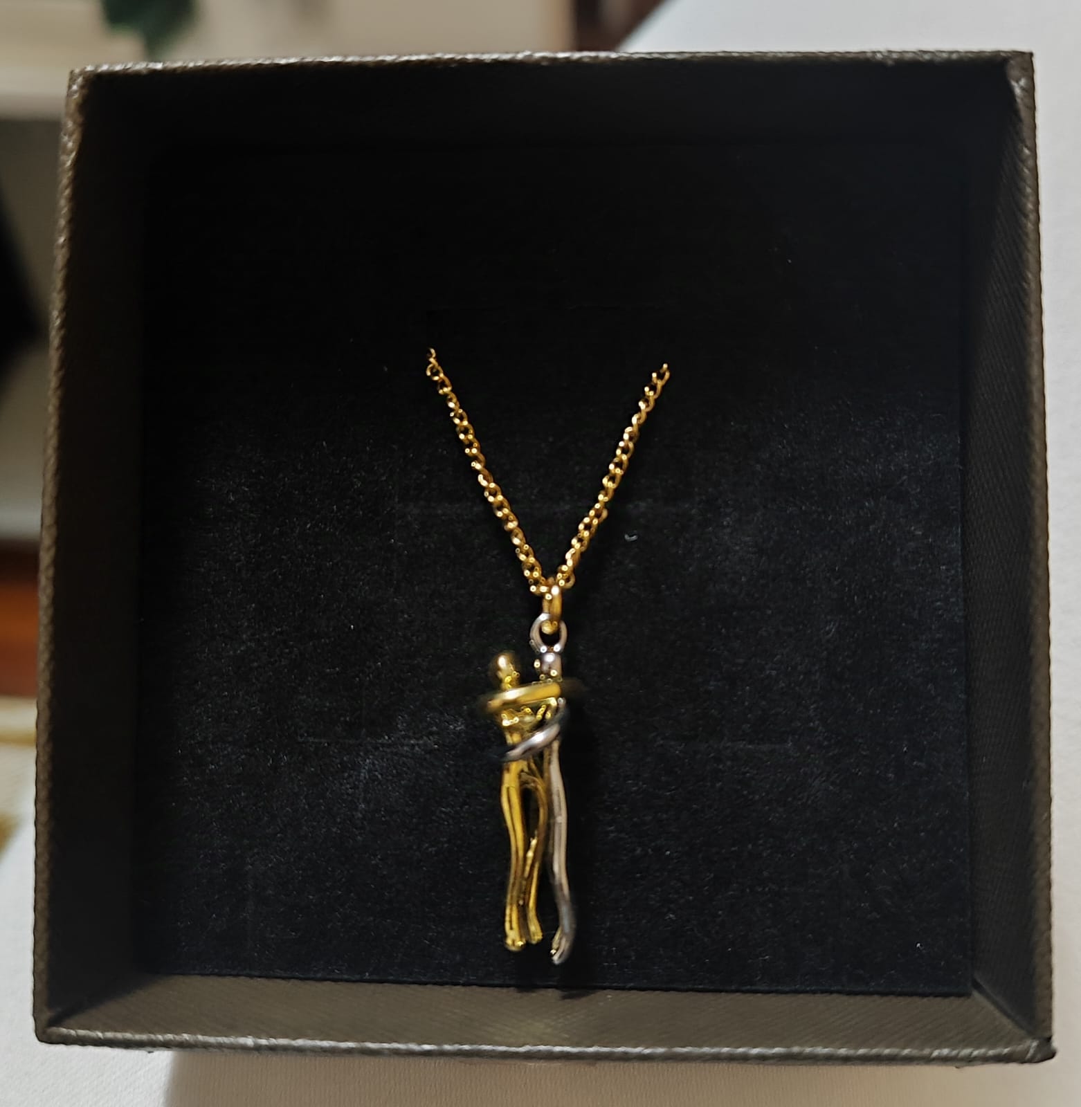 Este collar cuenta con una cadena de aproximadamente 30 cm en color dorado, lo que le da un toque elegante y sofisticado. Pero lo que lo hace realmente especial es el hermoso colgante de 3 cm de altura que representa un abrazo entre una pareja. ¡Es un símbolo de amor y cariño que cualquier persona estaría encantada de lucir!