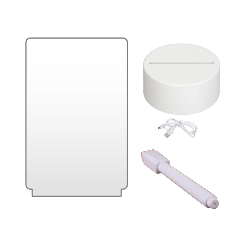 Incluye: 1 Placa acrílica, 1 Base de luz y 1 Marcador de escritura borrable. 🖊️📦