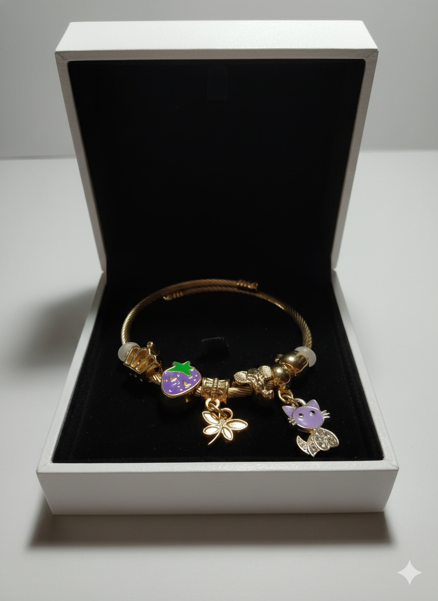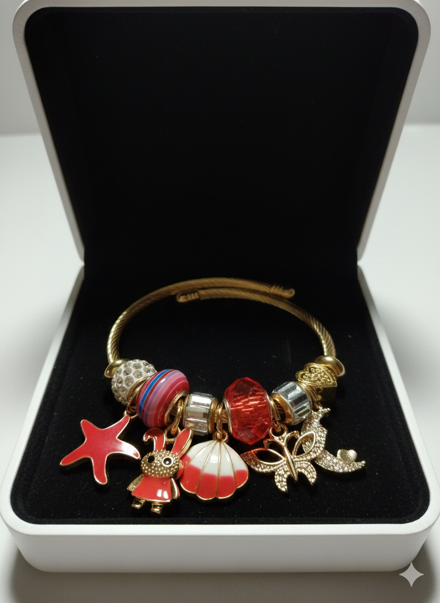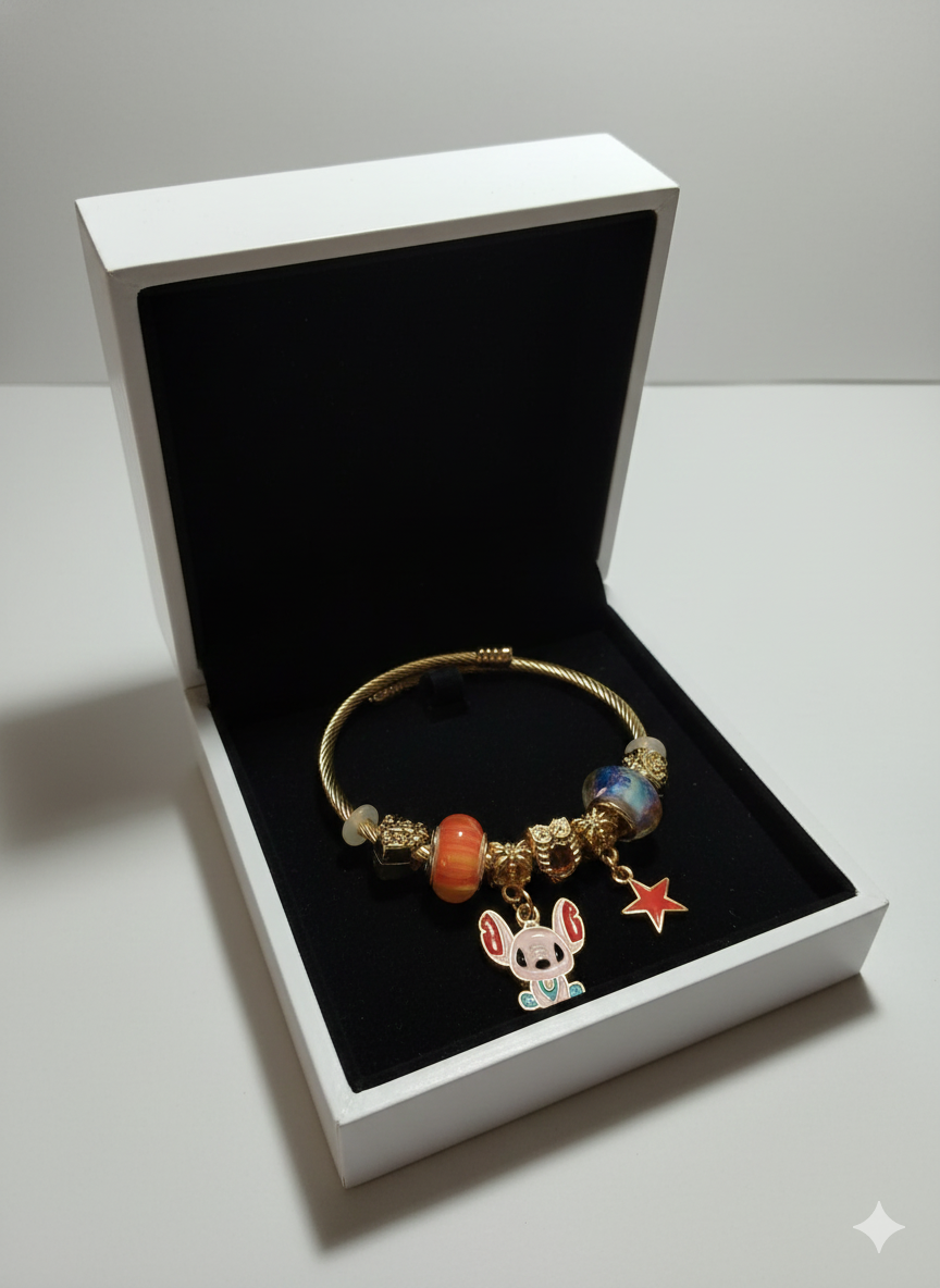 Pulsera con acabado dorado o plateado (depende cada modelo) y cuentas cristalinas que capturan la luz. Incluye de tres a cuatro charm grandes con temática y otros pequeños. Cómoda, ajustable a la muñeca.