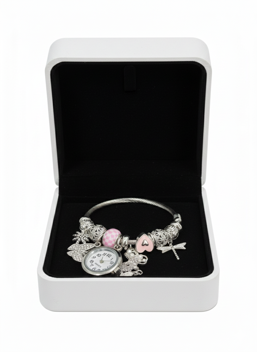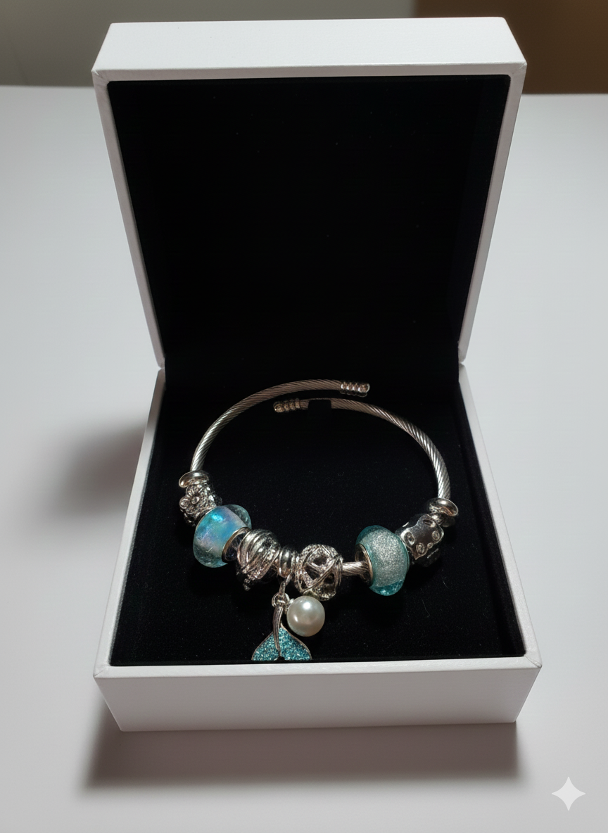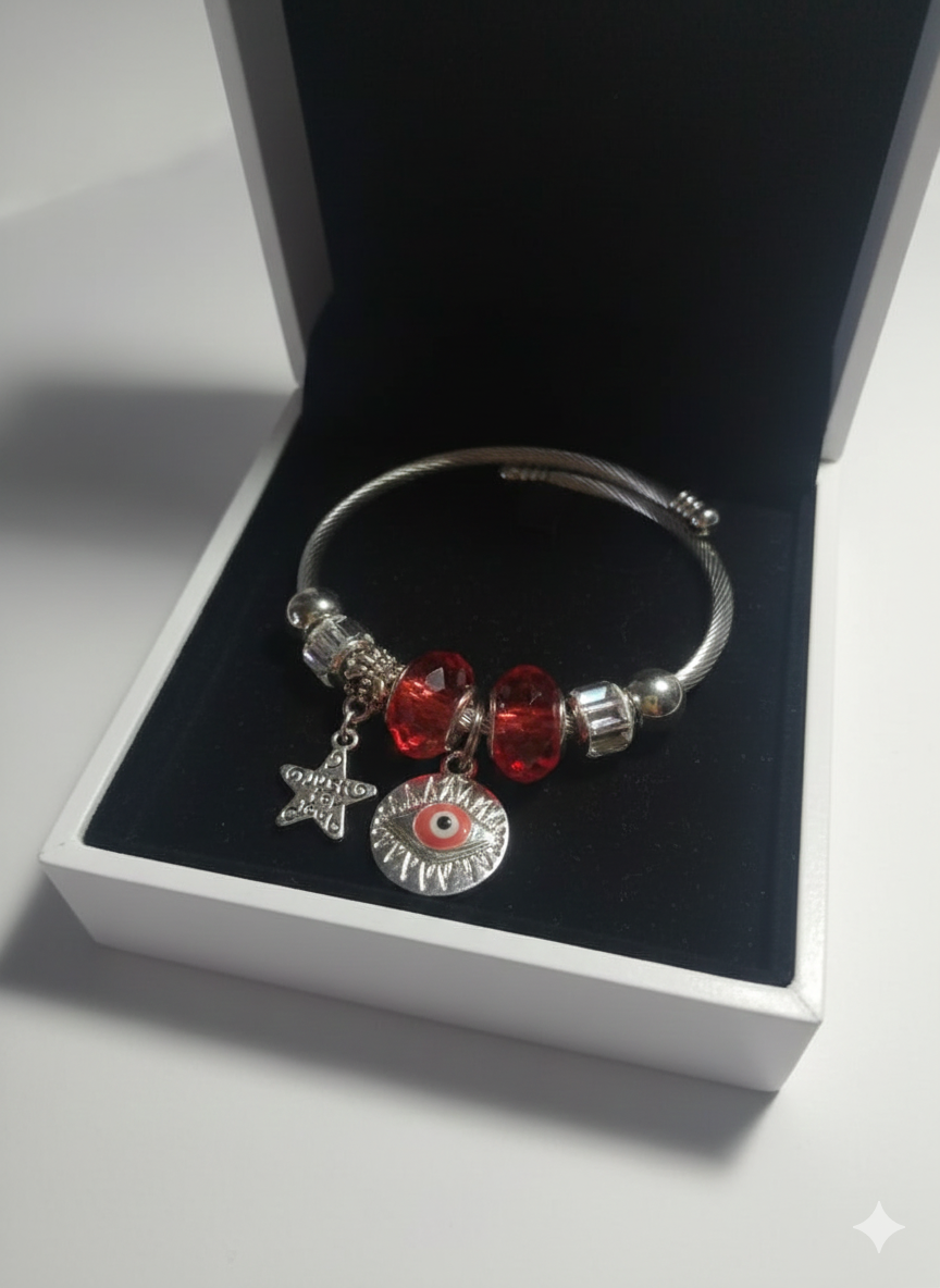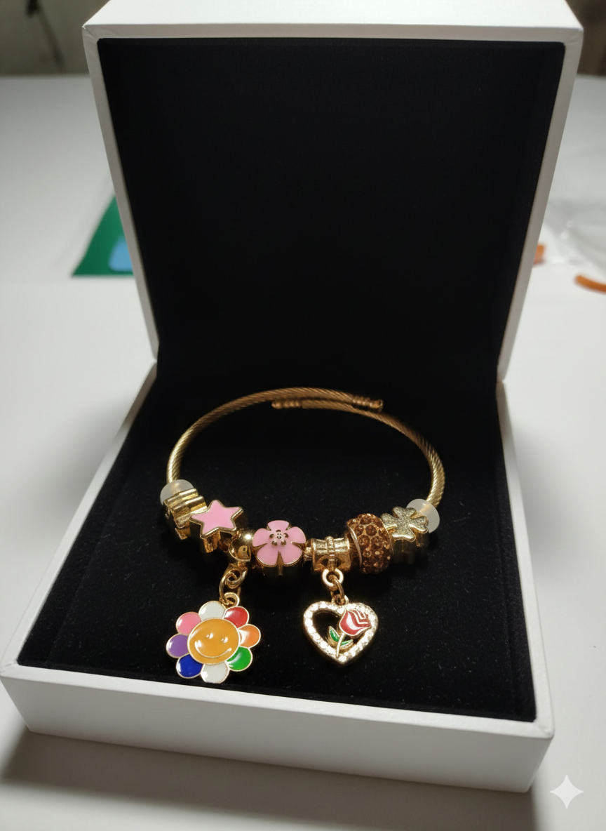Pulsera con acabado dorado o plateado (depende cada modelo) y cuentas cristalinas que capturan la luz. Incluye de tres a cuatro charm grandes con temática y otros pequeños. Cómoda, ajustable a la muñeca.